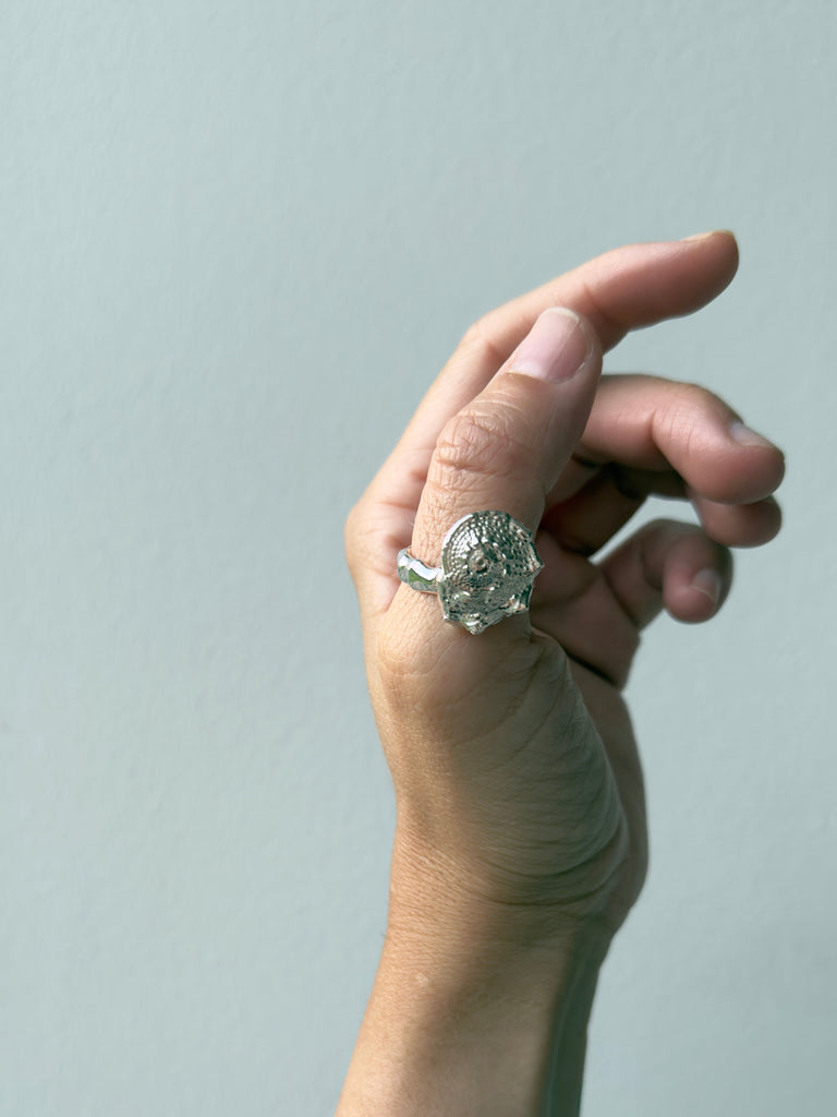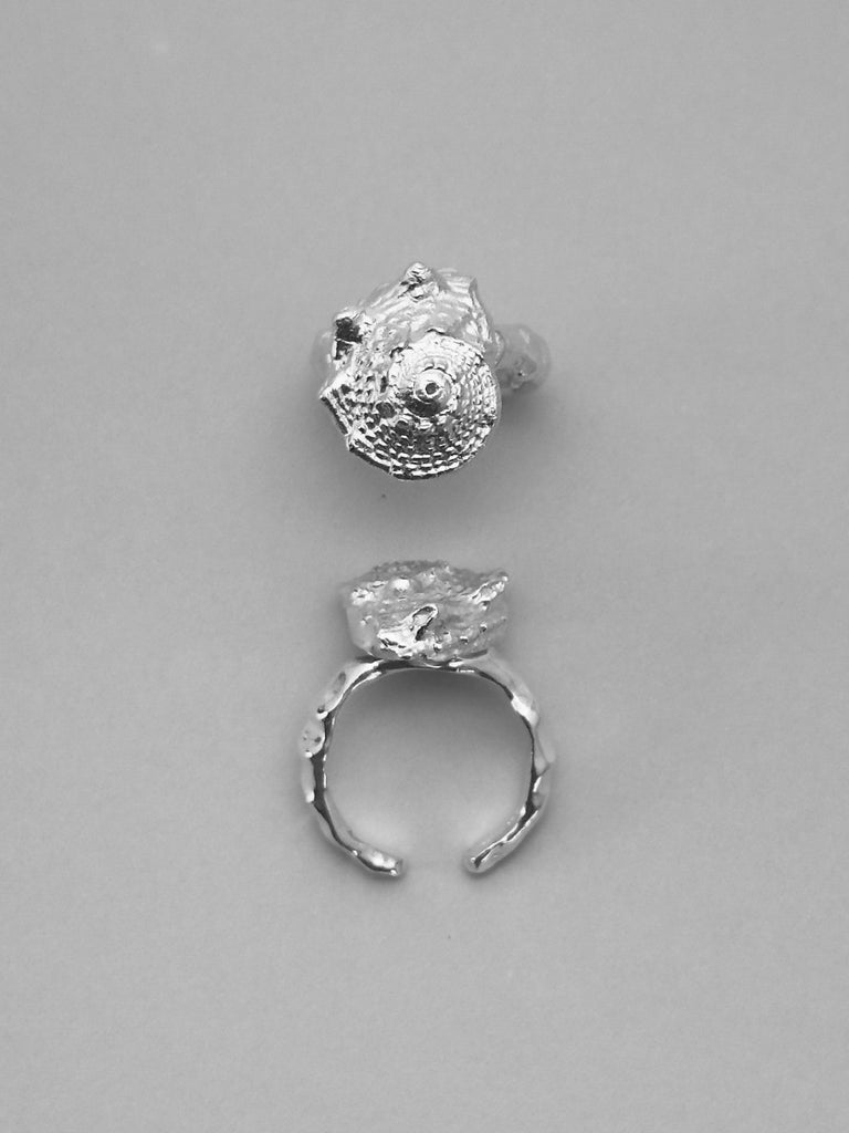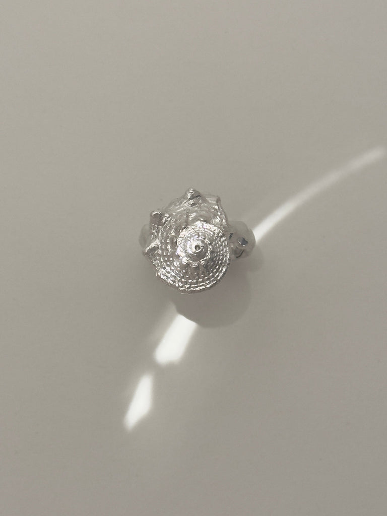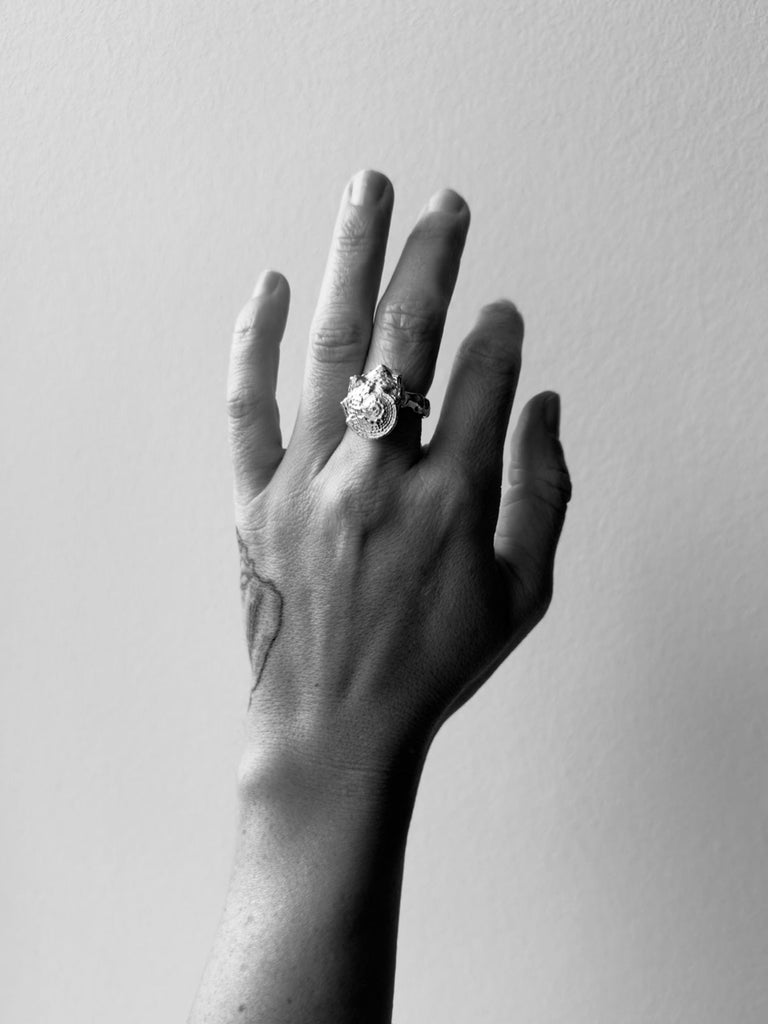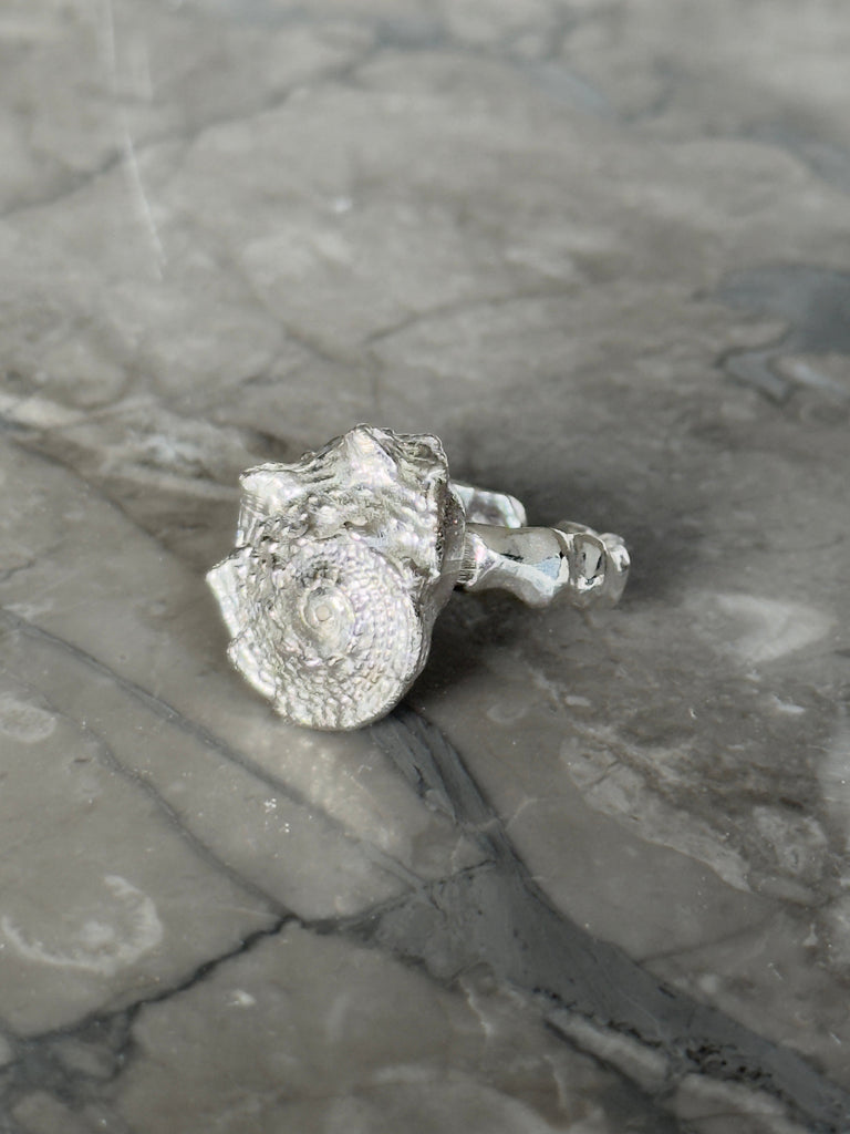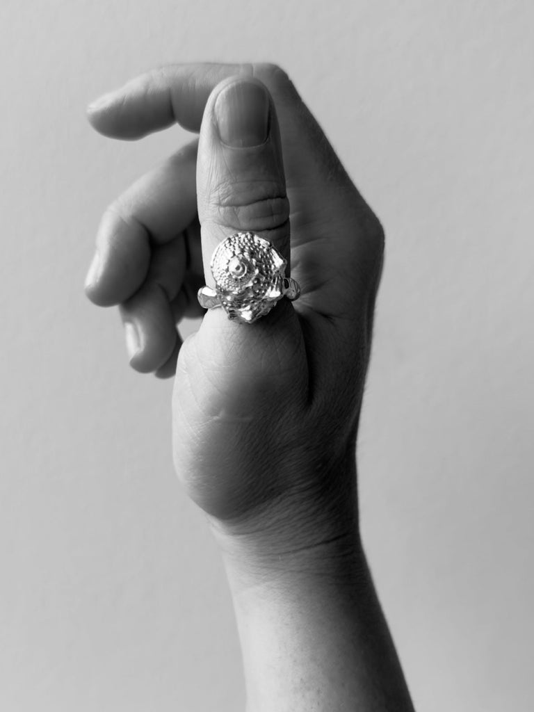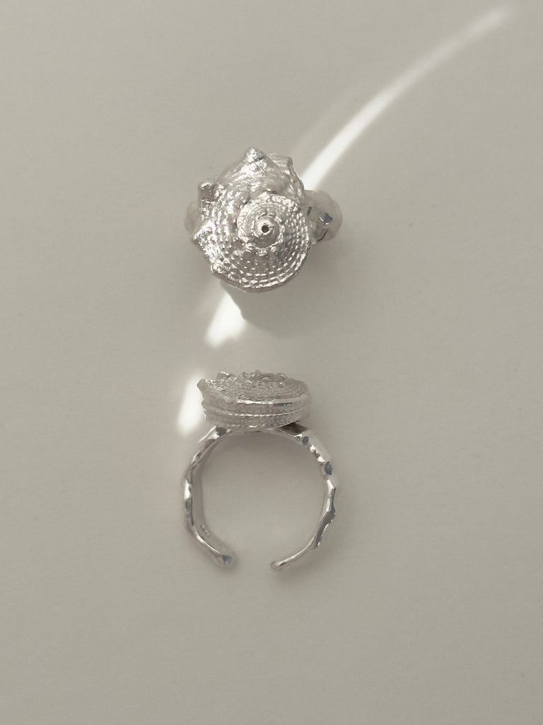 The name of this ring is “Star Shell.” It is voluminous and features the most beautiful details. The ring band is organic, just like the Ocean ring. Completely simple and yet incredibly beautiful.