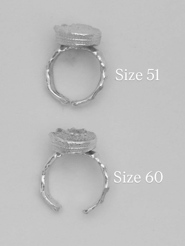 Star Shell is available in gold-plated 925 sterling silver or 925 sterling silver. It is adjustable and fits sizes 51-60, depending on how much you pull/push it. See also the pictures.
