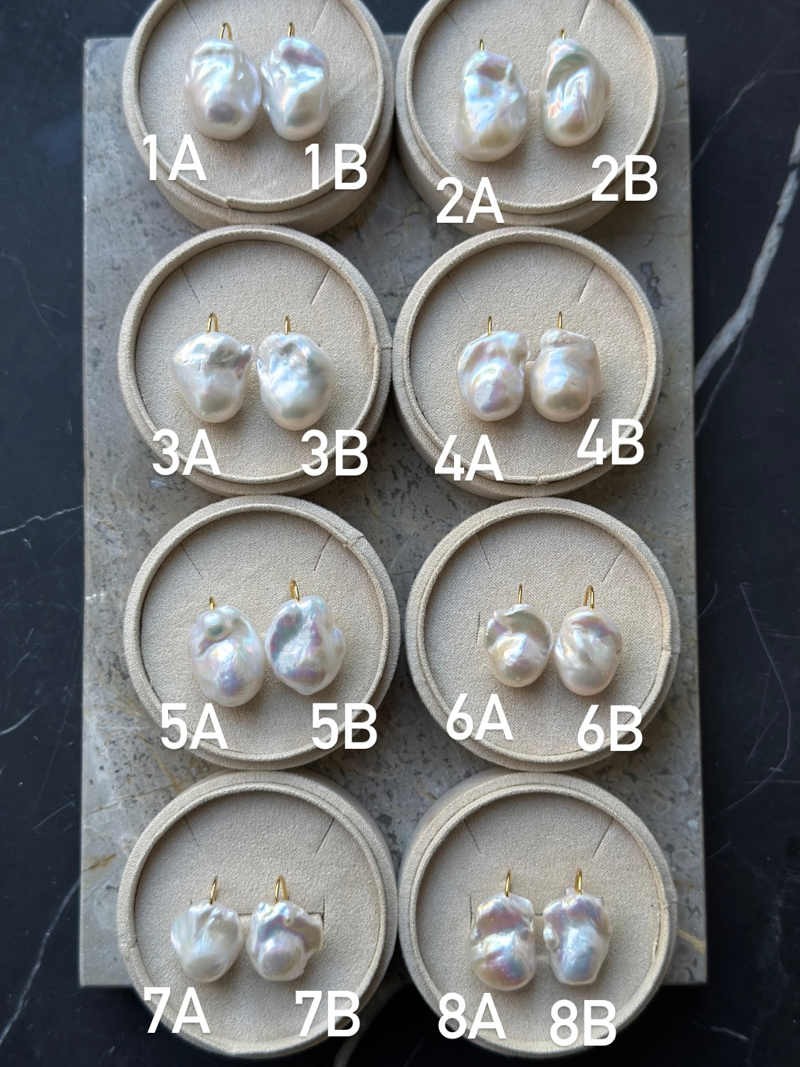 Occasionally, I have only sold the Snow White earrings as a pair, but this time it is entirely up to you how you want to mix and match, or if you simply want to buy a single earring. They are sold individually. However, I have tried to show which pearls go well together as a set, if you prefer that. For example, earring 1A and earring 1B would go well together as a set, etc.